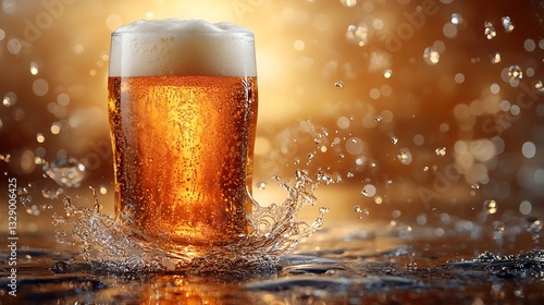 A luxurious beer pour, golden liquid splashing into a glass, foam overflowing slightly, ultra-detailed bubbles rising, warm glowing background, condensation forming on the glass,