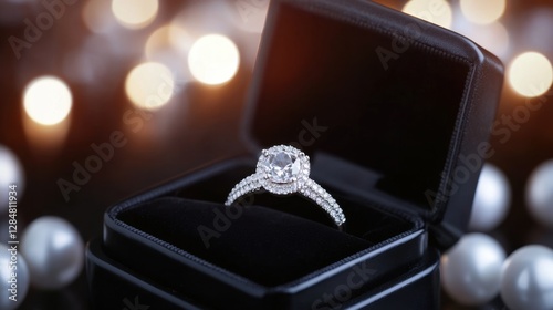 A luxurious black velvet jewelry box slightly open, revealing a dazzling ring inside