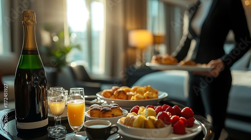 A luxurious breakfast cart being served by hotel staff, featuring fresh pastries, a bottle of champagne, vibrant fruit bowls, and steaming coffee,