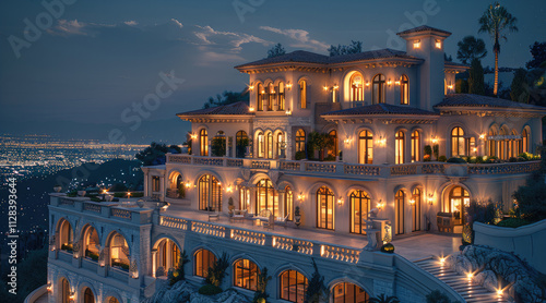 A luxurious classical mansion perched on a hilltop, featuring an elegant light cream stone facade, intricate architectural details, and arched windows glowing with soft golden interior lighting.