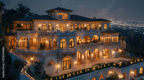 A luxurious classical mansion perched on a hilltop, featuring an elegant light cream stone facade, intricate architectural details, and arched windows glowing with soft golden interior lighting.