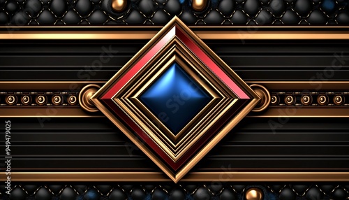 A luxurious design featuring a geometric jewel in vibrant colors, framed by intricate patterns and elegant materials.