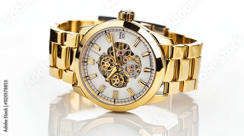 A luxurious gold watch with a transparent dial showcasing intricate mechanical movements.