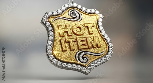 A luxurious golden badge inscribed with the words 'HOT ITEM' is adorned with sparkling diamonds.