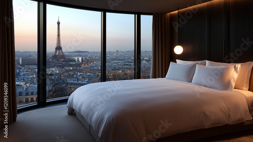 A luxurious modern hotel bedroom featuring a large bed with elegant bedding, floor-to-ceiling windows offering a breathtaking view of the Paris cityscape
