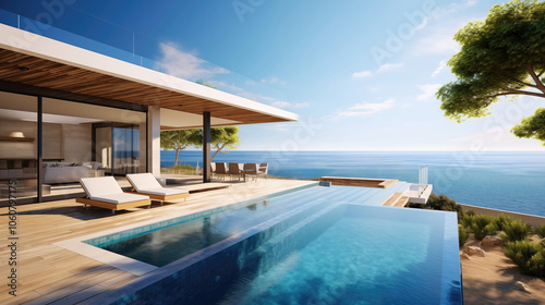 A luxurious modern villa with an infinity pool overlooking the sea. The terrace features sun loungers and a dining area, perfect for relaxation with breathtaking ocean views.