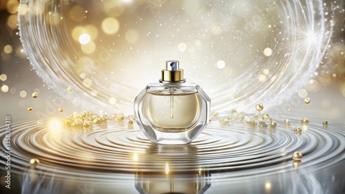 A luxurious perfume bottle rests on a shimmering, rippling surface, surrounded by golden spheres and a radiant, ethereal glow, evoking a feeling of opulence and sophistication.