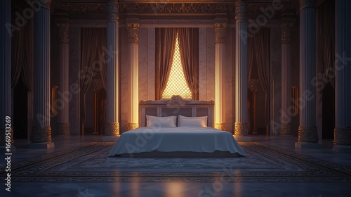 A luxurious room featuring an ornate bed, elegant curtains, and detailed columns, illuminated by warm light filtering through a decorative window.