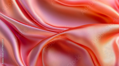 A luxurious silk texture in gradient hues of coral and rose pink, with abstract, flowing folds and smooth reflections creating an elegant background.
