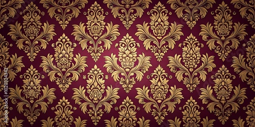 A luxurious tapestry of intricate golden swirls on a deep maroon background, reminiscent of a bygone era of elegance and sophistication.