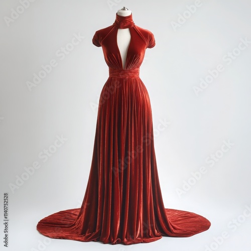A luxurious velvet gown with a high neckline and elegant draping on a white background
