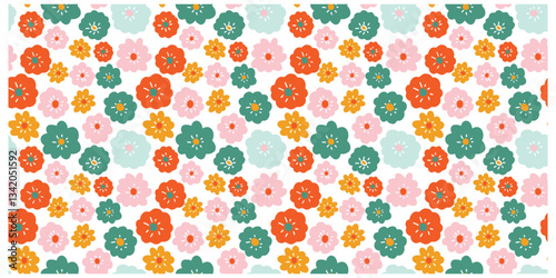 A luxury floral pattern multicolored retro flowers on a navy background, bordered by a decorative green and gold trim, It could be used as a wallpaper, fabric design, or other decorative elements