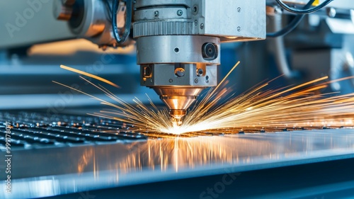 A machine is cutting through metal with sparks flying
