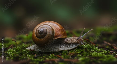 A macro capture of a forest snail crawling over mossy ground. The snail's shell has subtle spiral ridges with earthy tones, and its moist body glistens under the soft ambient light.