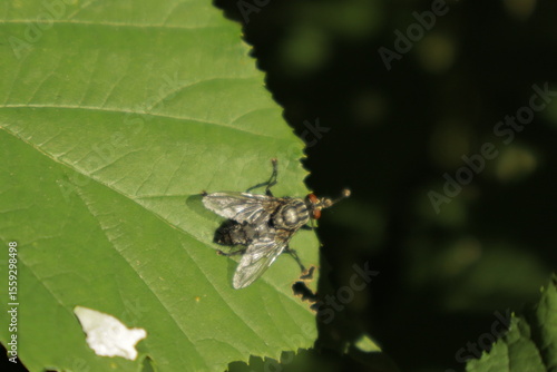 A macro close-up of a striped fly rubbing its legs together on a green leaf against a soft, blurred background, highlighting its red eyes and subtle yellow leg tips.