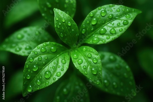 A Macro Perspective on Lush Green Leaves Glistening with Water Droplets