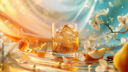 a macro photo of a colorful and artistic advertisement for a glass of whiskey. It shows a beautiful vintage coup cocktail glass of golden brown whiskey