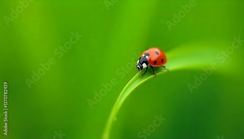 A macro photograph captures a ladybug perched on a blade of grass, set against a backdrop of lush greenery