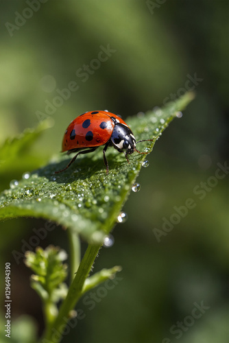 A macro shot of a ladybug, showcasing its vibrant red shell with black spots, perched delicately on a green leaf, highlighting nature's tiny wonders