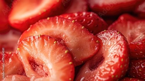 A macro shot of strawberry slices piled together, focusing on the detailed texture of the fruits flesh and seeds, with juice glistening on the surface.