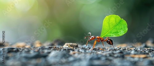 A macro view of an ant carrying a leaf piece, demonstrating strength and determination,