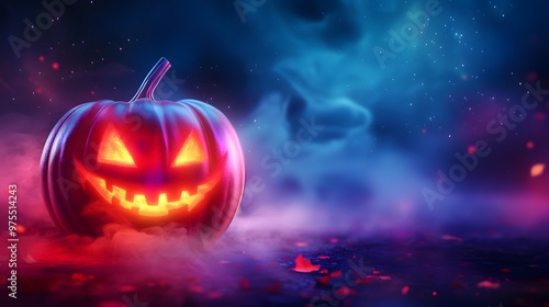 A magic pumpkin with vibrant neon carvings, glowing in the night sky, with mystical fog swirling below, cool and eerie