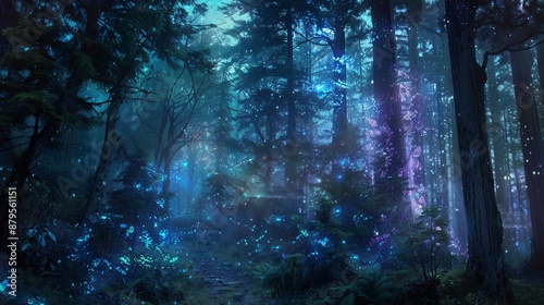 A magical and mystic forest scene bathed in enchanting blue and green bioluminescent light, capturing the ethereal beauty and otherworldly aura of a nighttime woodland environment.