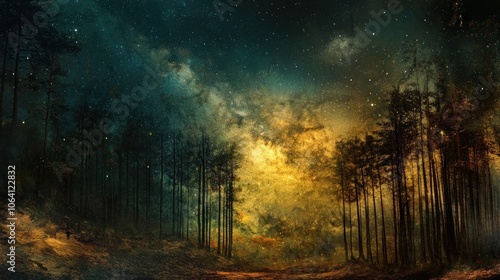 A magical forest with a starry night sky above.