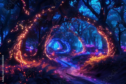 A magical forest with glowing lights illuminating a serene path through twisted trees and vibrant foliage.