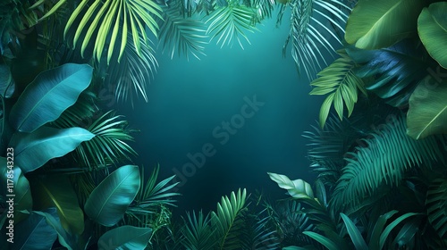 A magical image framed by glowing green tropical leaves on a dark background. Perfect as a design background for a fantasy atmosphere or a glowing nature theme, with a mysterious, enchanting feel.