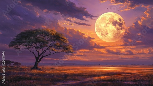 A magical savanna landscape at dusk, with the sky painted in golden and purple hues and a giant moon rising behind a solitary acacia tree