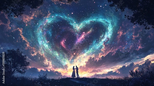 A magical scene of a couple dancing under a sky filled with Northern Lights forming a heart shape