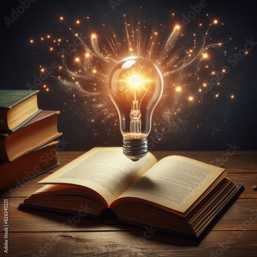 A magical scene with a light bulb glowing over an open book, emitting sparks on a wooden table, symbolizing ideas and learning.. AI Generation