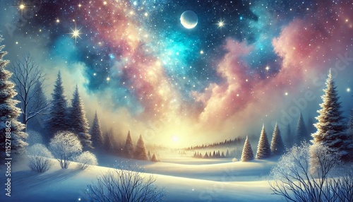 A Magical Winter Evening with a Dazzling Starry Sky and Soft Pastel Tones in a Fantastical Scene