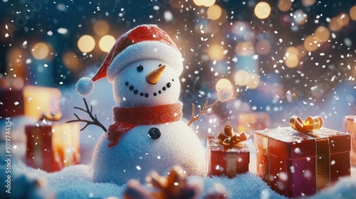 A magical winter wonderland featuring a snowman and gift boxes, with snowflakes falling softly from the sky.