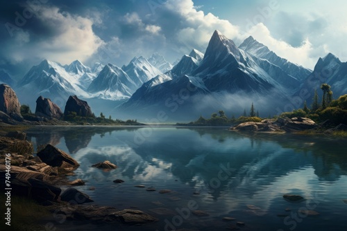 A magnificent landscape of mountains, trees and sky reflected in a clear mountain lake. The concept for the development of tourism, mountaineering, skiing, rock climbing, excursions in the mountains.