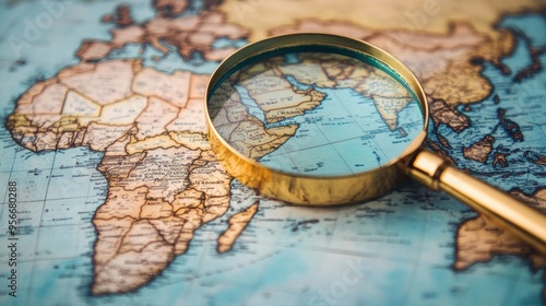 A magnifying glass focusing on a continent on a world map, highlighting the geographical details in sharp clarity. Exploration and discovery concept.