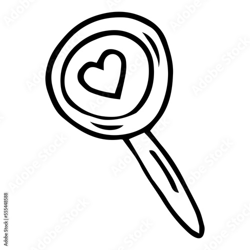 A magnifying glass looks at a pink heart. Romantic flat illustration. Love cute postcard Valentine. Hand drawn vector simple graphics. Isolated doodle design elemen