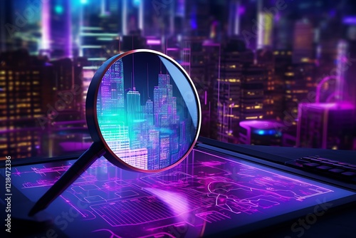 A magnifying glass reveals a vibrant, holographic cityscape on a digital tablet, surrounded by futuristic urban neon lights and glowing schematics.