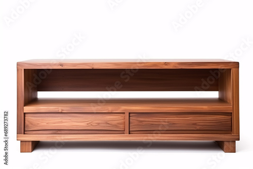 A mahogany TV stand standing alone against a pristine white backdrop is photographed from the front.
