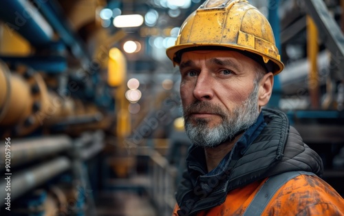 A maintenance engineer wearing a hard hat and safety gear stands confidently in an industrial setting, overseeing operations and ensuring equipment functionality
