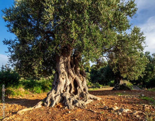 A majestic, ancient olive tree stands proud in a sunny, rural field