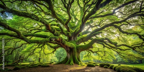 A majestic, ancient tree with a thick layer of moss covering its trunk and branches, foliage, nature