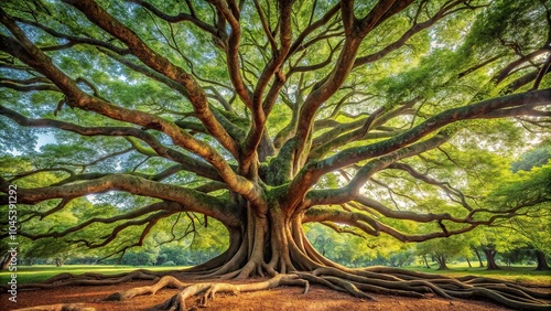 A majestic ancient tree with gnarled branches and roots stretching out in all directions, its trunk thick and sturdy like a pillar, foliage, organic, roots, wilderness