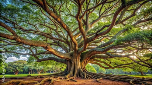 A majestic ancient tree with gnarled branches and roots stretching out in all directions, its trunk thick and sturdy like a pillar, leaves, greenery, landscape, trunk, wilderness