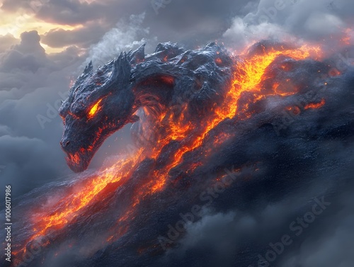 A majestic and mythical Pixiu creature crafted from glowing lava perched vigilantly on the edge of an active volcano with ash and smoke billowing around it as it watches over the treacherous