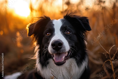 A majestic australian collie stands proudly in a lush green field, its snout open in a joyful bark as it gazes out into the world