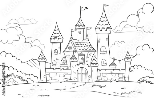 A Majestic Black and White Illustration of a Grand Castle, Set Against a Dramatic Sky with Fluffy Clouds, Surrounded by Rolling Hills and Lush Greenery.