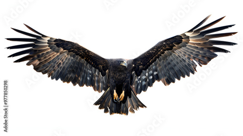 A majestic black kite soaring through the air on a white background with copy space, wings arched gracefully