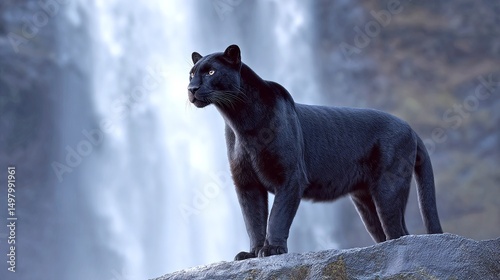 A majestic black panther stands confidently beside a stunning waterfall. The elegant form of the panther contrasts beautifully with the cascading water. A perfect blend of wildlife and nature. AI